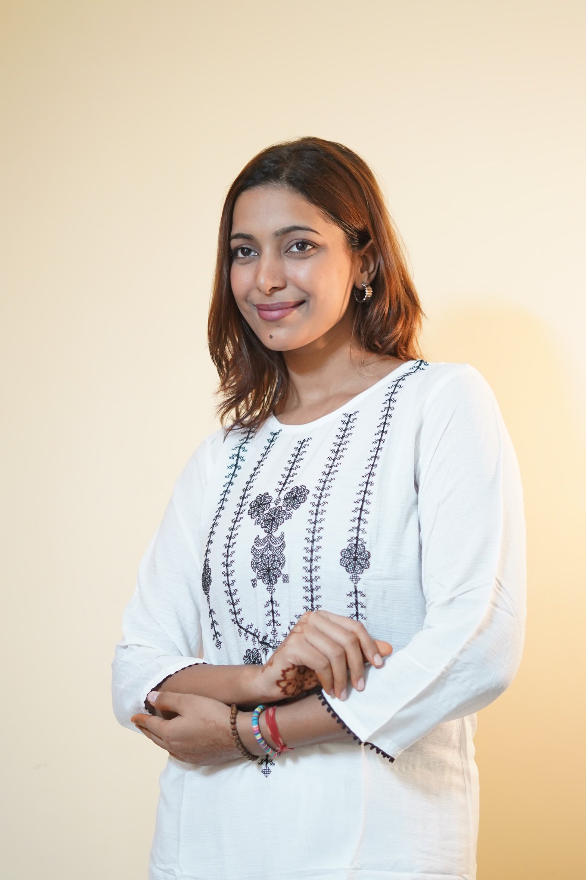 Step into effortless elegance with this White & Black Floral Panel Embroidered Tunic, designed to bring together simplicity and sophistication. Made from soft rayon fabric , this tunic features intricate black floral thread embroidery in vertical panels across the front, creating a visually slimming and refined effect.